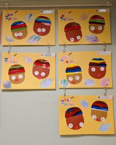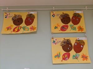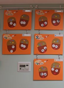 1歳児さんはシールを貼ってどんぐりの帽子を作りました?