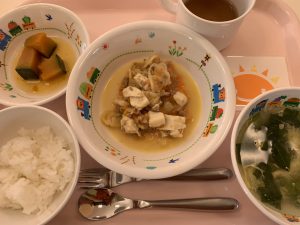 軟飯 マーボー豆腐 卵コーンスープ かぼちゃの煮物