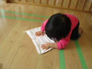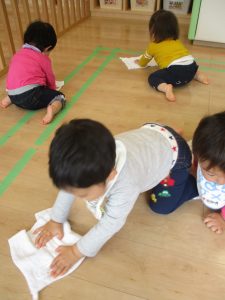 1歳児さんは一生懸命動き回ってお掃除!