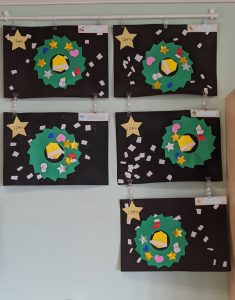 リースの周りにのりで飾りをつけました。![]()