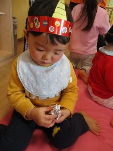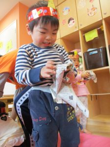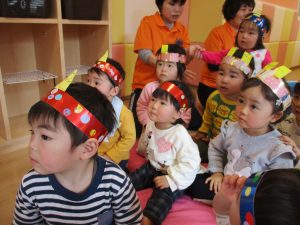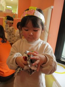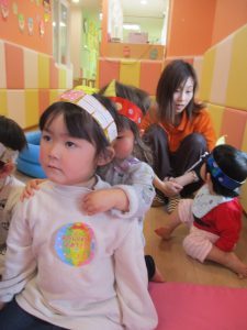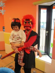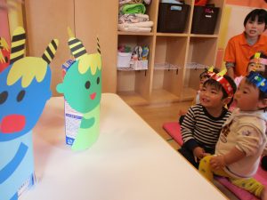 まずは、豆まきの絵本を読んで鬼退治のお話?