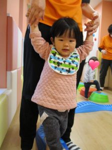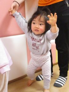 つなぐ手の強さを調節して段々と一人でバランスがとれるよう導きます。