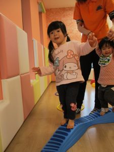 0歳児さんは保育者と手をつないでバランスをとっています。
