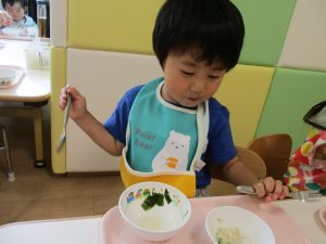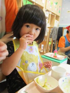 いつもは苦手なそら豆を頑張って食べていた子どもたちですっ