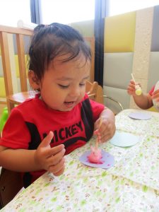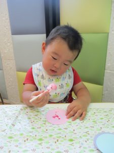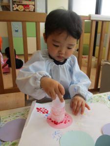 1・2歳児さんは、違った形のタンポで紫陽花の柄をポンポンしましたよ~