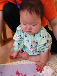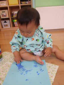 初めてがいっぱいの0歳児さんも、絵の具だらけになりながらがんばりました?