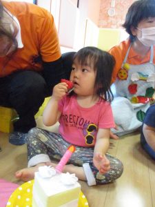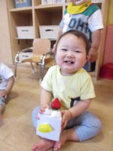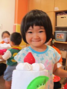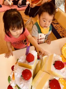大きなケーキは、誕生児のお友だちが切り分けてくれてみんなに配ってくれましたよ〜?