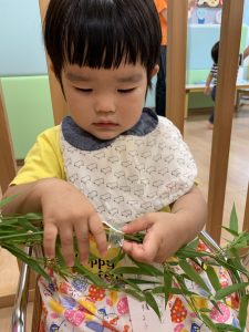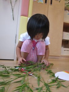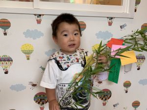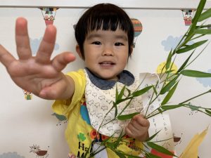 保護者の皆さまにご協力いただいた願い事を綴った短冊は、子どもたちが思いを込めて笹につけました!