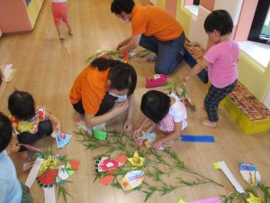 保育園では定番の季節行事となり、短冊に願い事を書いて飾ったり七夕にちなんだ絵本を読んで楽しむ様子が見られますね。
