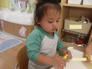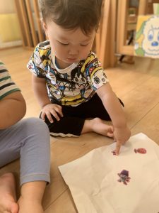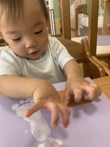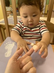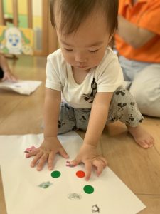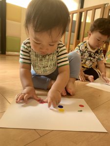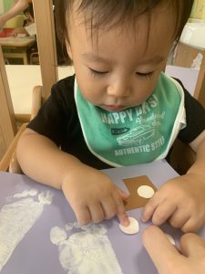 つい最近までお口に運んでいたシールを丁寧に紙に貼っていく0歳児さんたち・・・