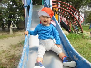 滑り台を楽しんでる横で公園にいっぱいの落ち葉に目がいく2歳児さん