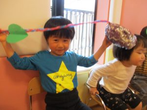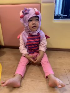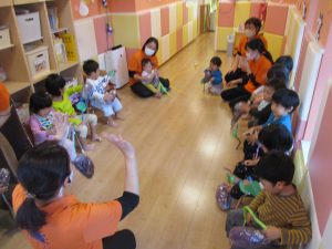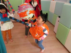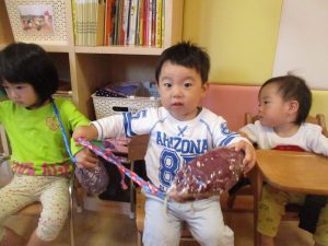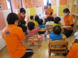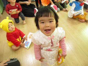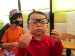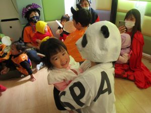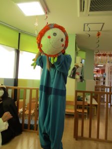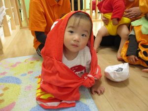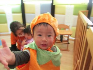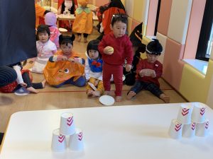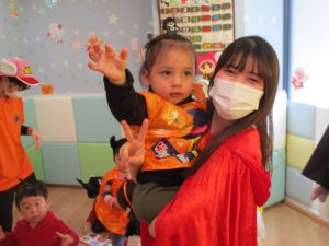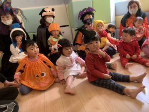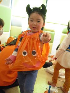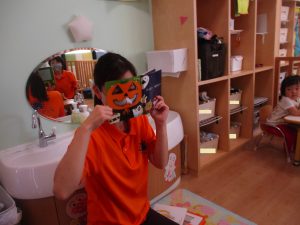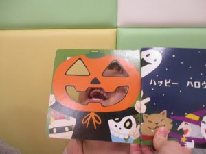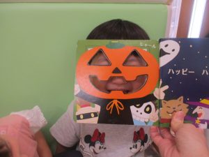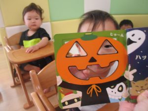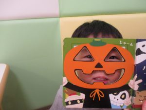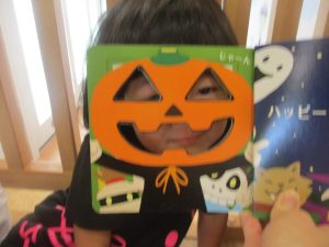 おばけが出てくると嬉しそうに顔を隠しながら「きゃー」といつも楽しんでいます。最後はお面を被ってお菓子をもらいにしゅっぱーつ✊僕も僕も!わたしも~!とお面を被ることを楽しみにしている子どもたちです。
