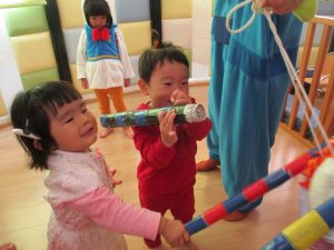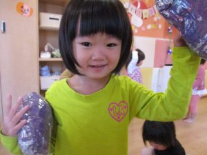少し手でビリビリもしましたが叩き割ると中からお菓子が?‼!それを見た子どもたちの目がキラキラに~(笑)