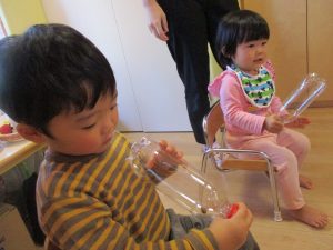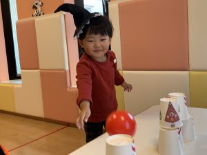 ねらいを定めて「えい!」2歳児さんは上手にボールを投げて倒していましたよ。