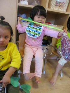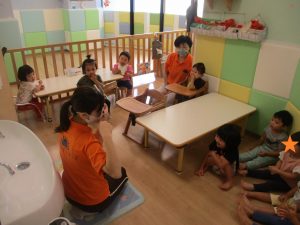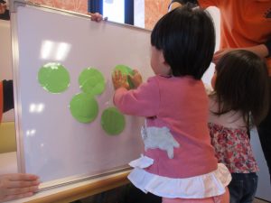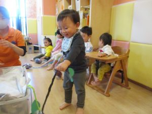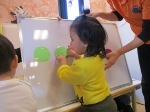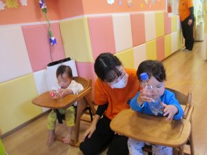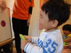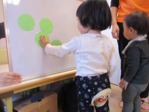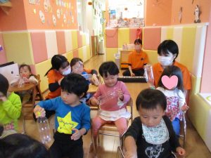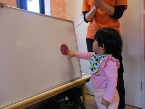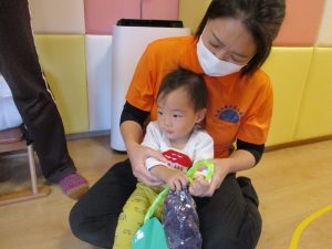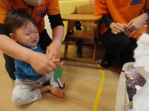 1歳児さん、0歳児さんは保育者と一緒に「ぽいっ」、ボールを片手に持ち、反対の手でぽん✊(笑)