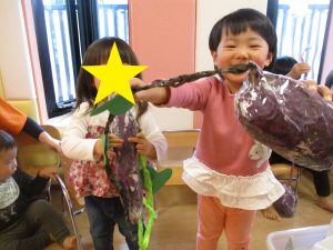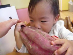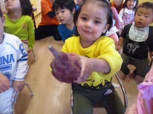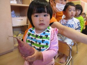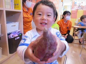 みんなで本物のお芋を触ったり匂いを嗅いだり…![]()