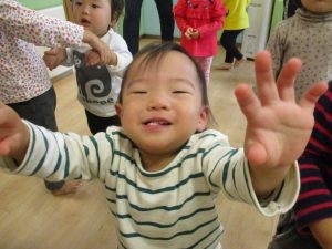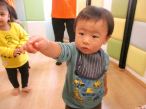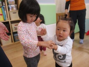 0歳児さんの手をとって教えてくれる優しい2歳児さんの姿も![]()