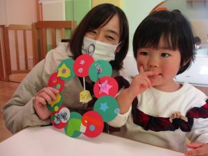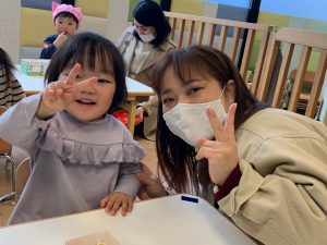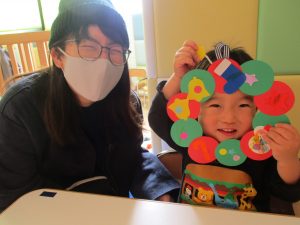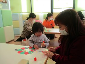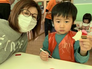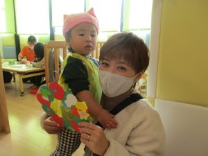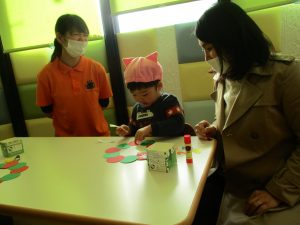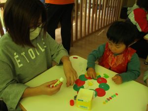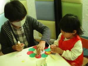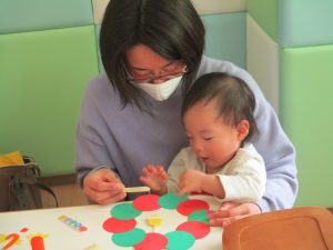 お母さんと一緒に糊付けをしてくれた1歳児さん