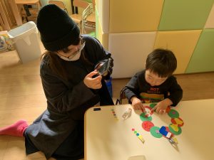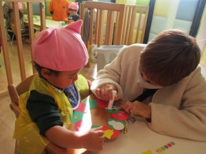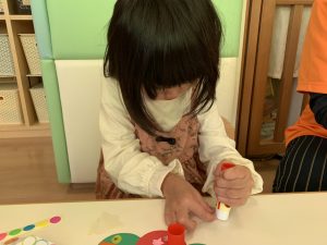 自分で製作を進めていた2歳児さん