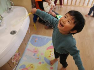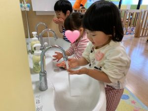子どもたちも登園するとすぐ手洗いうがいや消毒が習慣になってきました。
