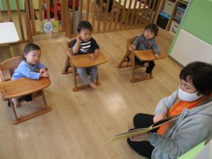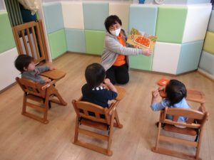 みんなで揃っての読み聞かせだけでなくクラスごとの活動時にもたくさんの本を読み聞かせています。