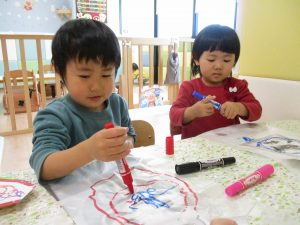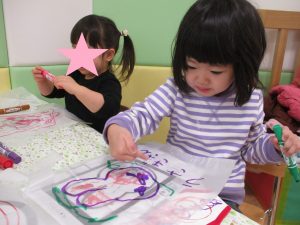 2歳児さんは、半透明のビニールに好きな絵を挟んで写し絵?とっても上手にできました。