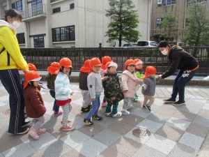 防災頭巾を被り、保育者の話を聞いてみんなで上手に避難することが出来ました?