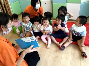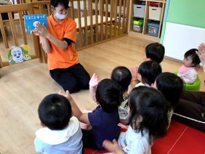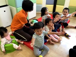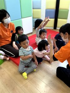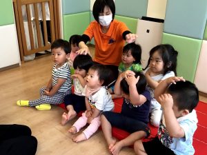 保育者が雨を表現すると、濡れないように手で頭を守る子どもたち‼