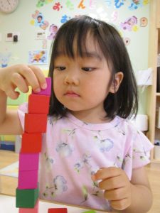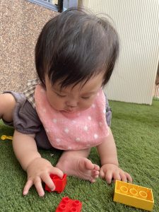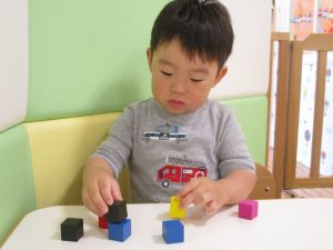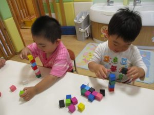 保育者と同じ形・色を真似して積み上げてみたり、高く積み上げたり、、