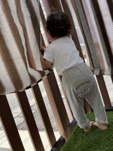 手に届く距離まで近づくとお気に入りの柵!?を手に取り嬉しそうに遊ぶ姿