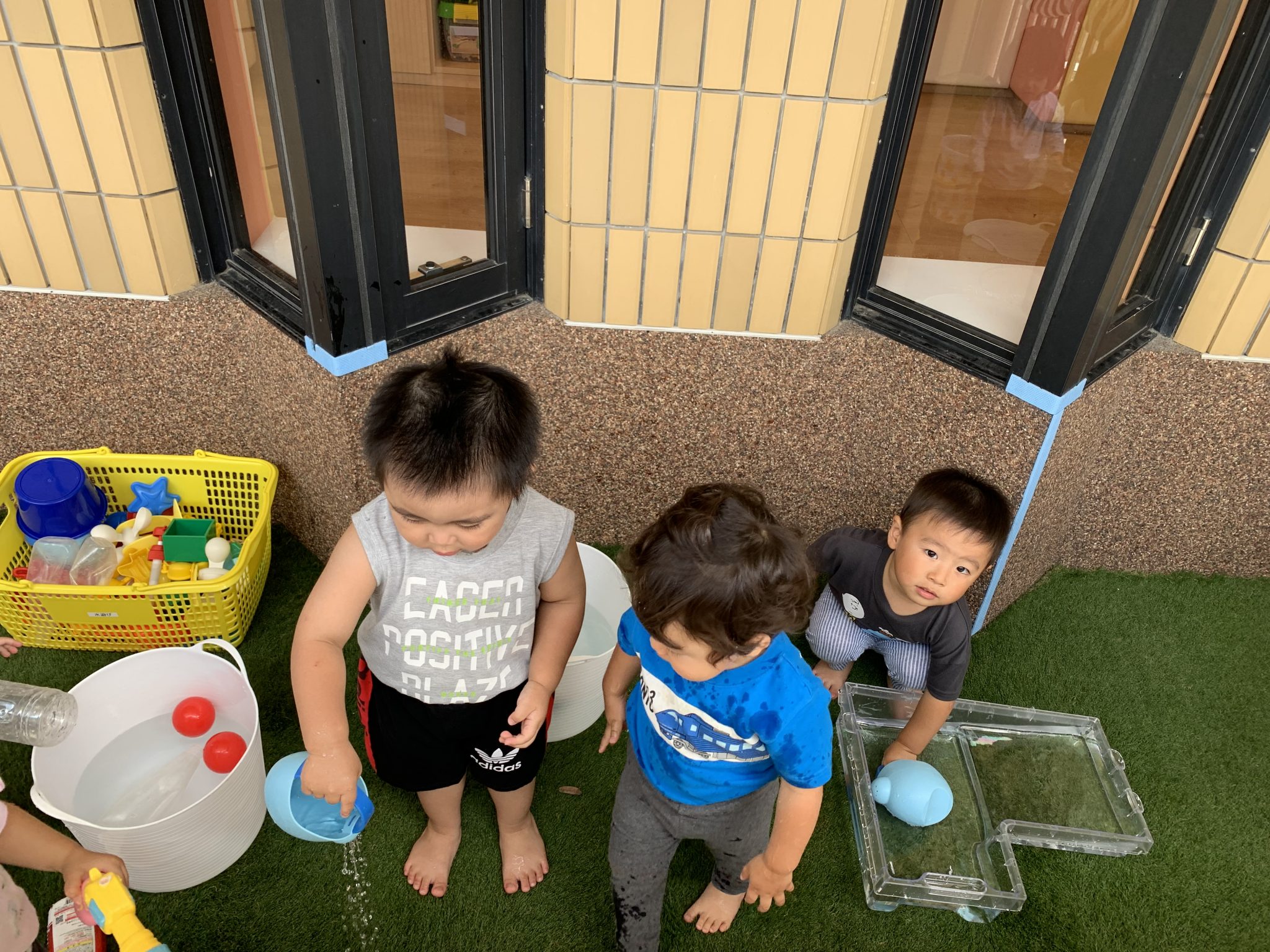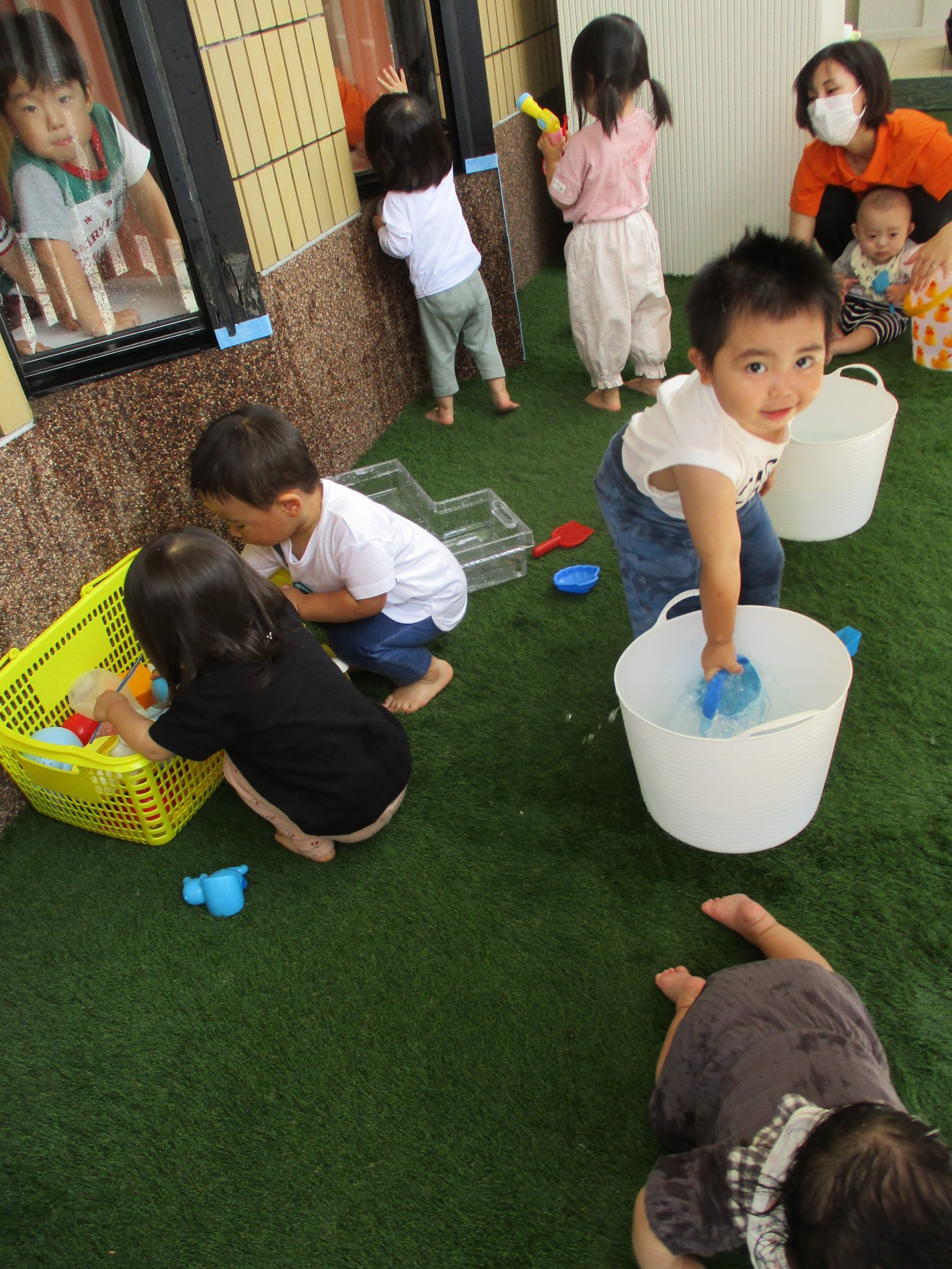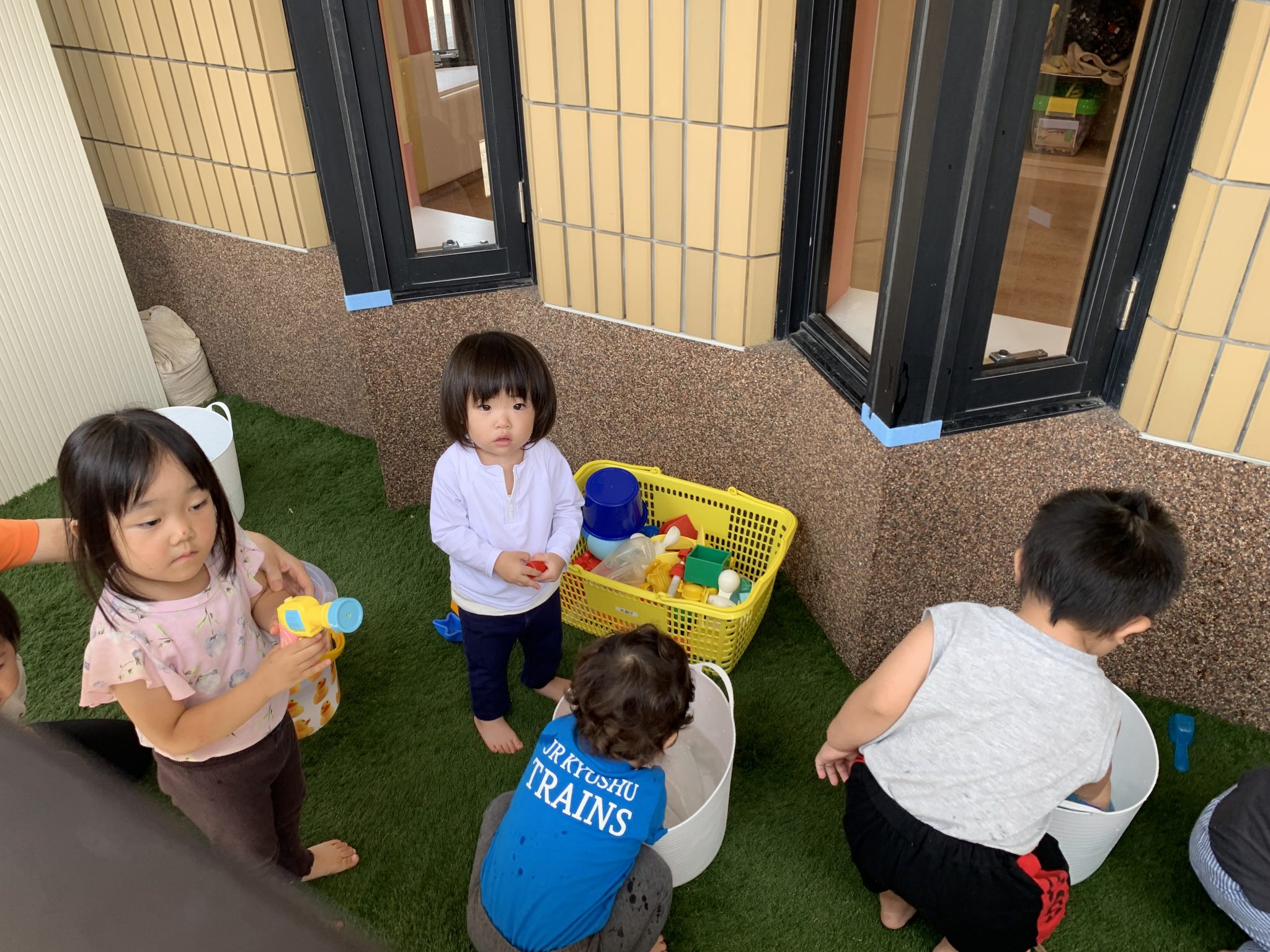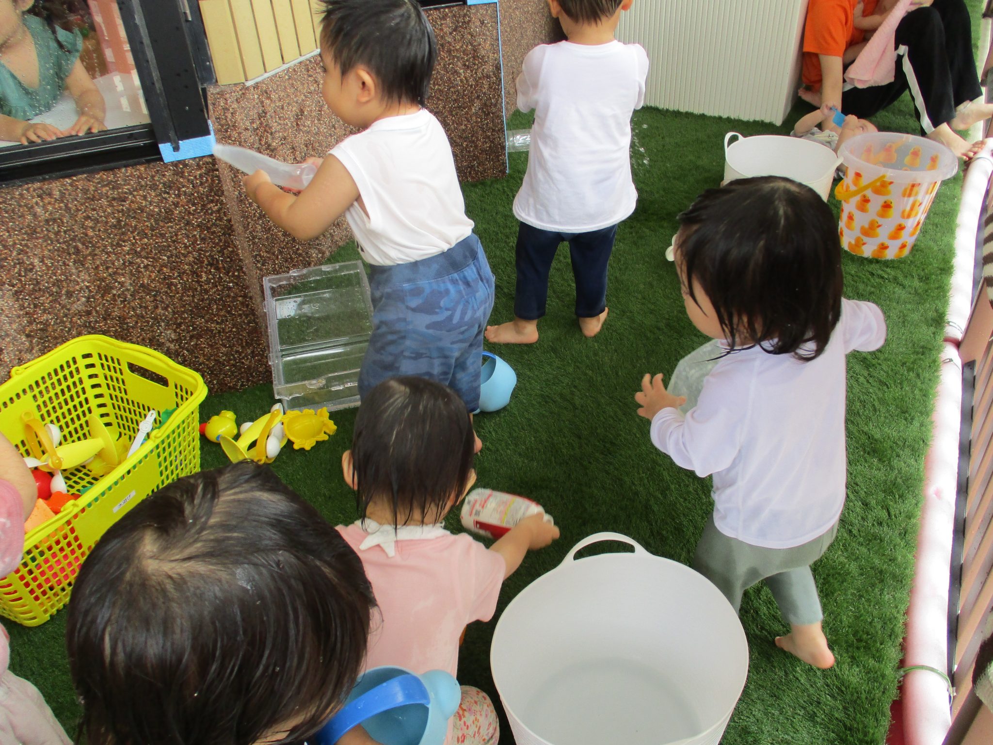まだまだ水遊びに慣れなくて泣いてしまう子も…夏の終わりにはみんな笑顔で自ら水をかけている姿が想像でき安心して見守っています✨