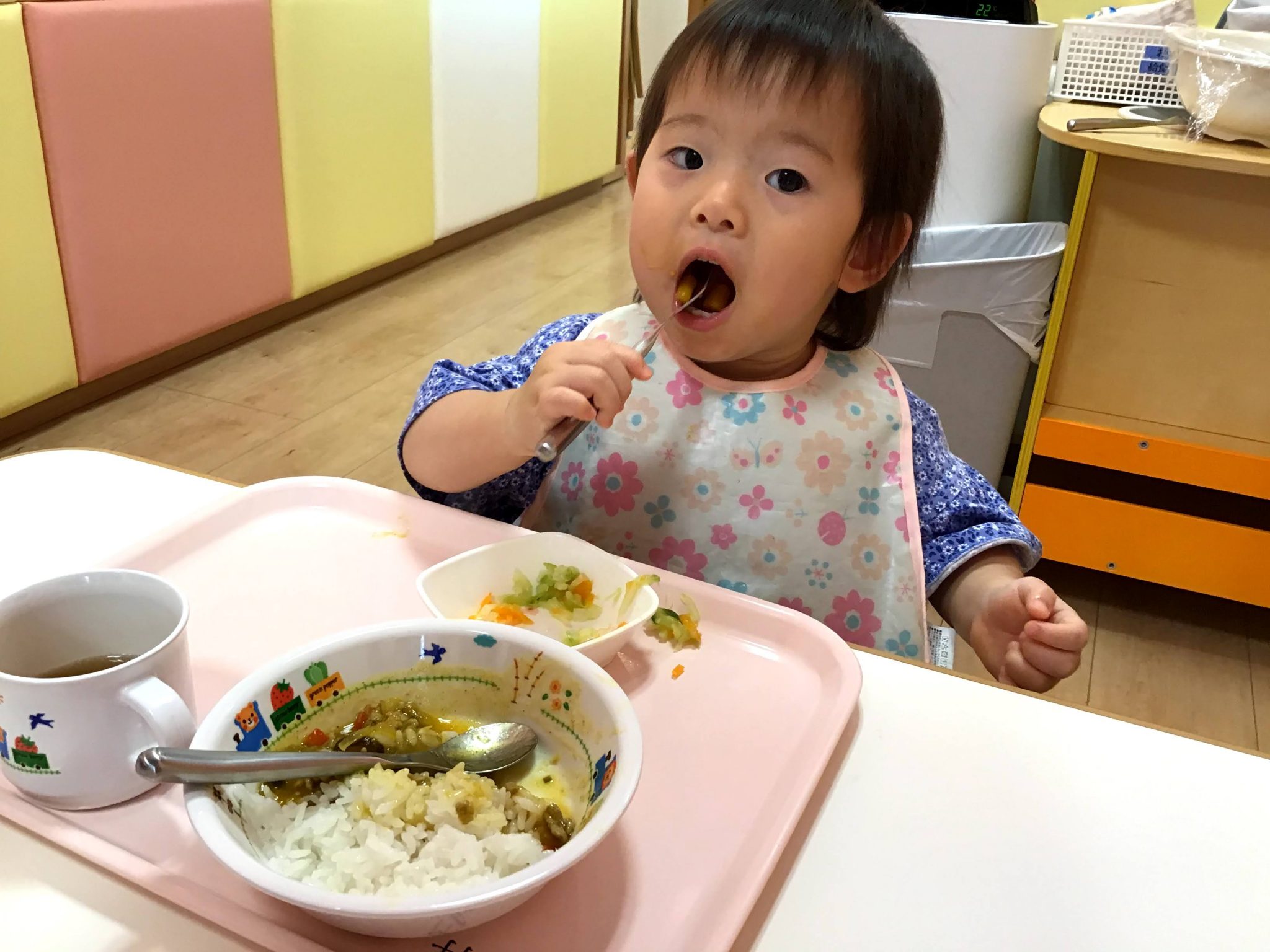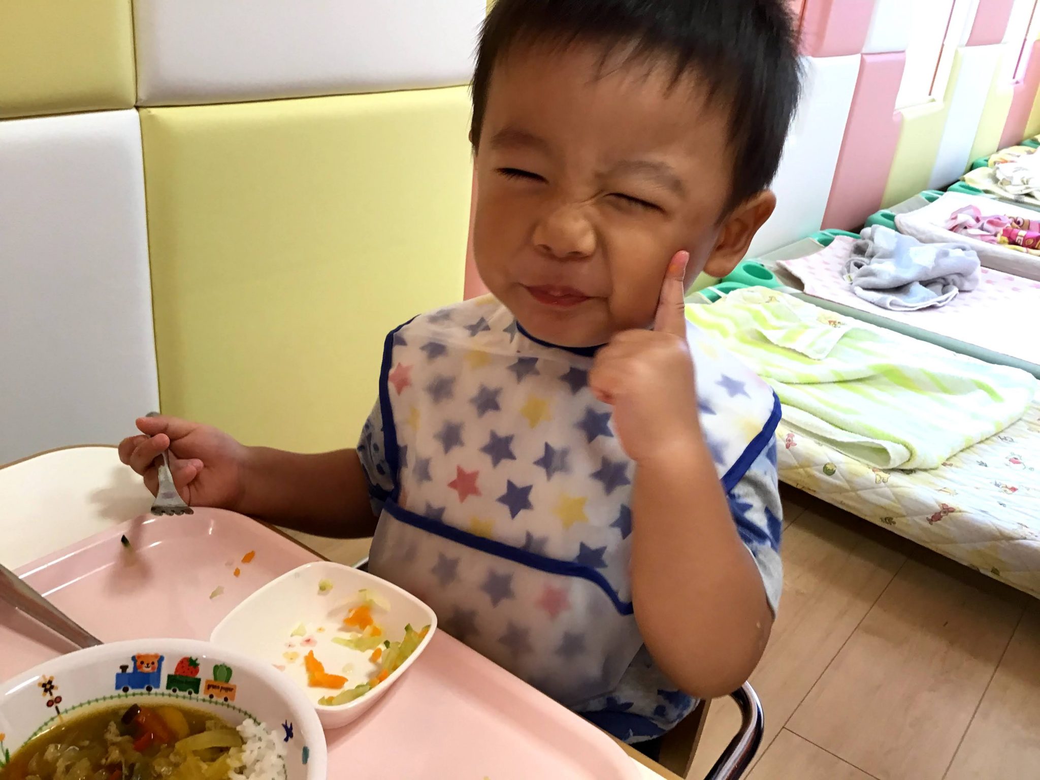 フォークににんじんをさして嬉しそうに見せてくれたり