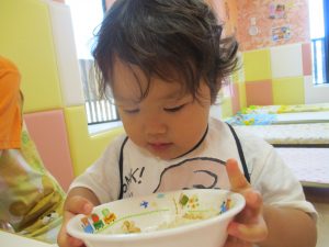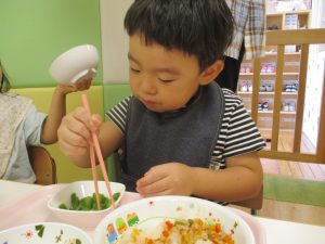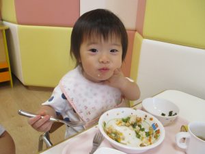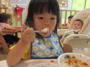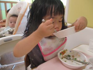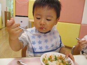 園では自分でフォークやスプーンを使って食べている子が、ご家庭では口を開けてご飯を待っている…![]()