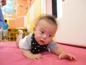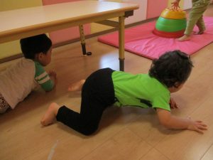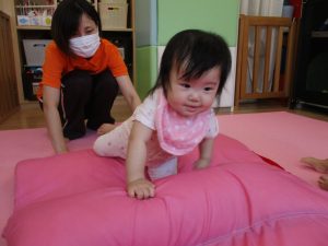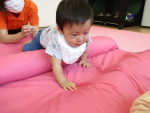 0歳児は、マットの下に障害物を置き凸凹道を作ることでハイハイやずり這いを通して様々な運動機能を促すことができます。