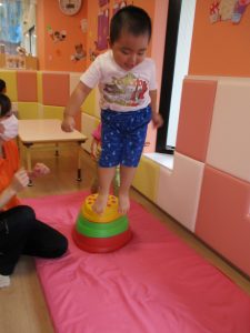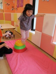 1、2歳児はサーキット遊びを通して平均台やバランスストーンでバランス感覚を養い、
