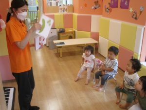 同じ歌を歌ううちに1歳児さんもわかるところは言ってみたり、それらしく言ってみたりと興味を示してくれるようになりましたよ。