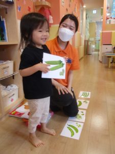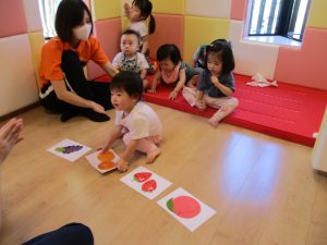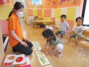 フラッシュカードを用いて果物や野菜の名前・色を英語で言い当てクイズ✨✨