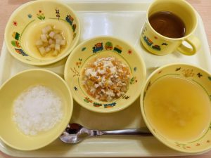 粥 味噌汁 豆腐と野菜のくず煮 スティック野菜 粉ふき芋