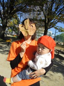保育者のいつもと違う姿に、興味津々な0歳児さんでした?