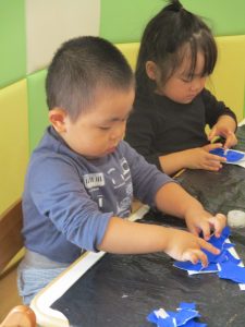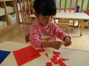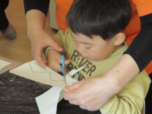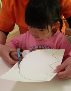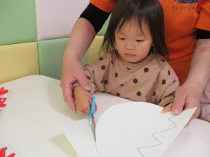 安全に配慮しながら保育者と一緒にチョキチョキ✂