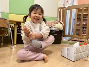 まだまだ練習中ですが、子どもたちは「1、2の3〜!」の合図でよいしょっとズボンを上げ、にこにこ?
