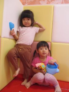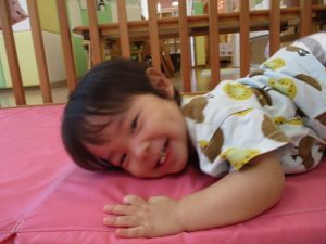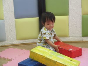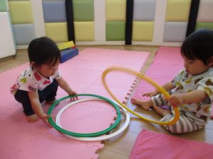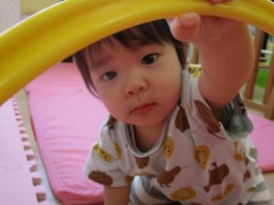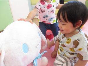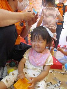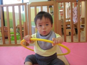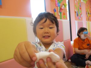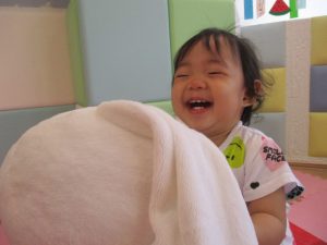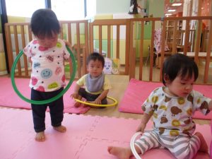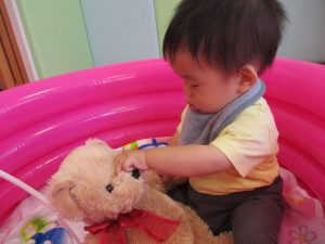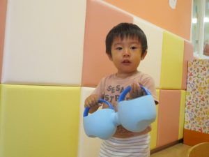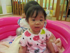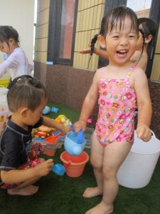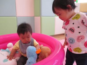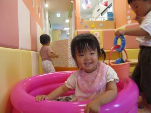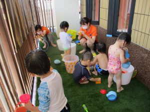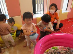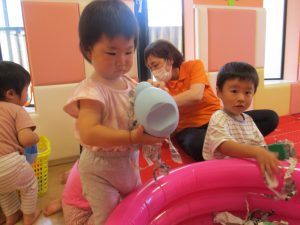 0歳児さんは室内遊び、1.2歳児さんは今年度初水遊びをしました!