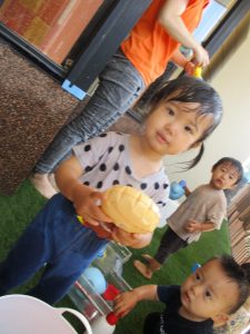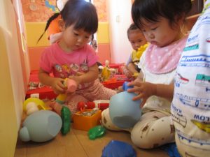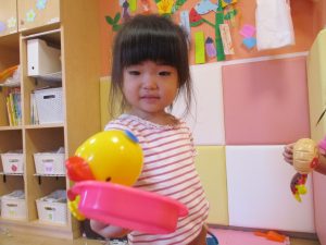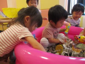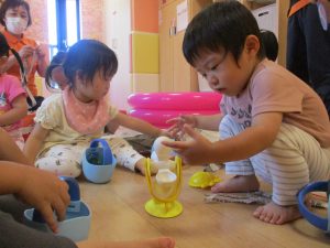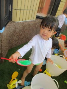 水遊びのおもちゃを出すと「新しいおもちゃ!?」と興味津々な子どもたち?