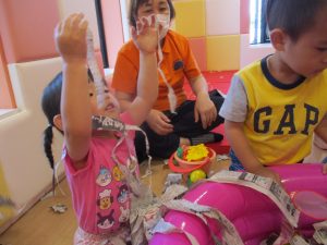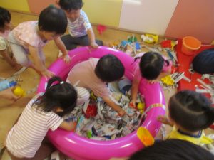 一足先に水遊びのおもちゃとプールを出して新聞紙を水に見立てて遊んでみましたよ〜?