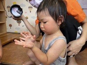 保育者の作るシャボン玉に、キャッキャと楽しそうな声