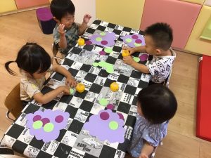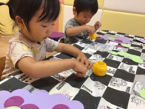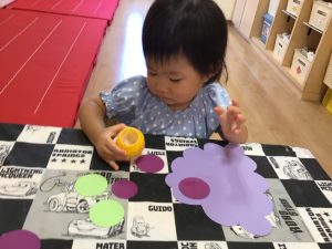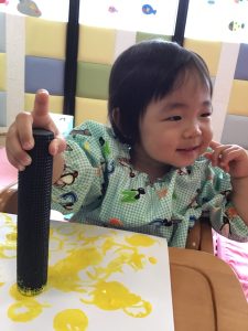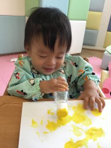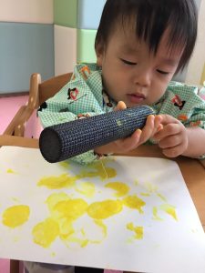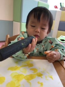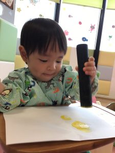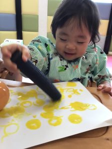 黄色の絵の具をつけたタンポを手にすると、不思議そうに観察する子どもたち😳