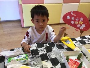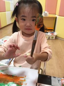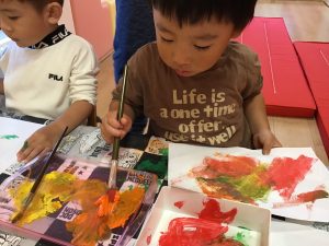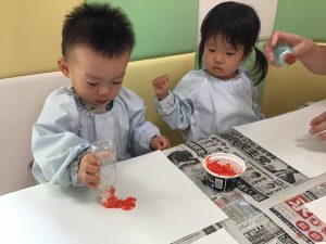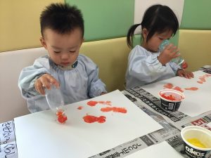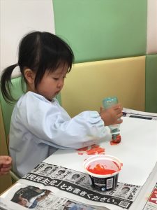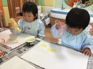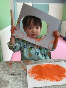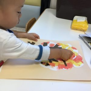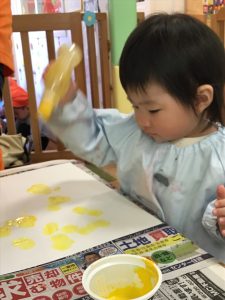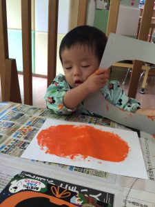 1歳児さんはオレンジと黄色の絵の具を使ってタンポ!!