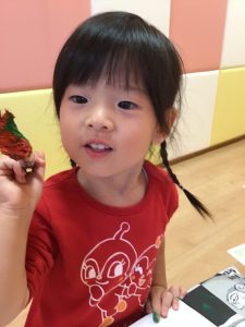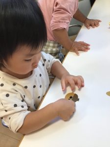 最後はみんなが大好きなどんぐりに目や口を付けてペッタン!!
