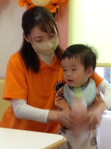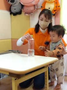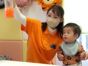 0歳児の友だちに手伝ってもらって、ジュースづくりの開始!