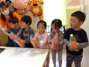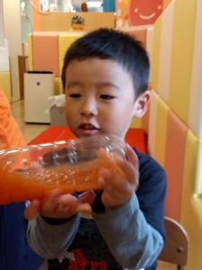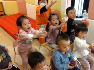 出来上がったジュースをみんなで持って、「かんぱ~い!🍹」